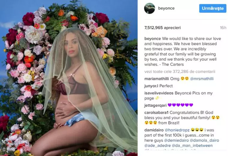 Cântareața, care a anunțat miercuri că așteaptă gemeni cu soțul ei Jay Z, a strâns în 15 ore peste 7,5 milioane de like-uri și 372 000 de commenturi la poza cu burtica de gravidă postată pe rețeaua de socializare.